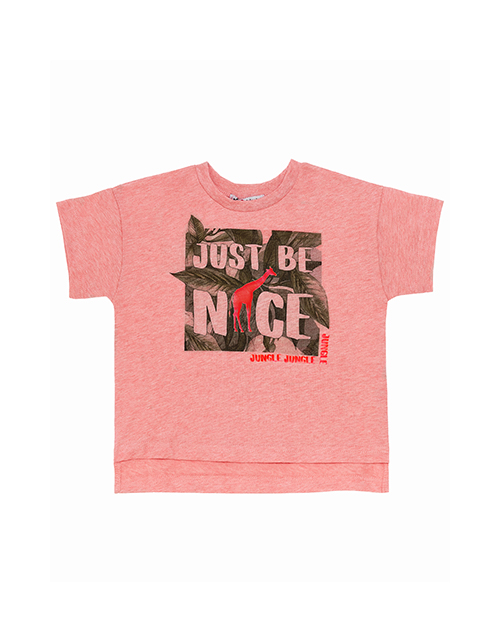 Футболка для мальчика цвета розовый меланж с удлиненной спинкой. Круглый вырез горловины. Принт в стилистике капсулы "Джунгли трип".