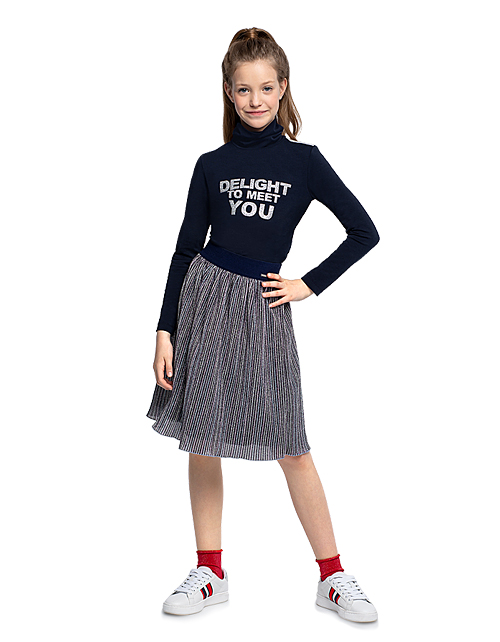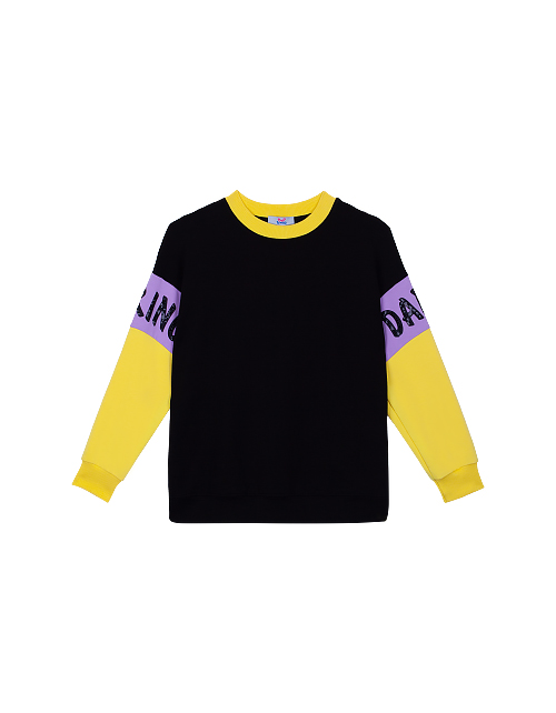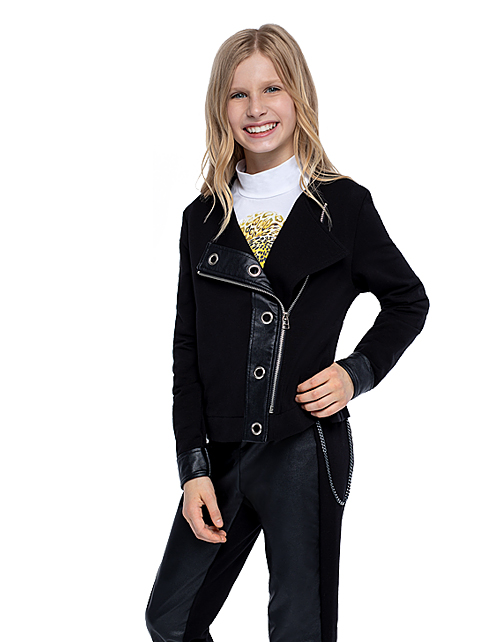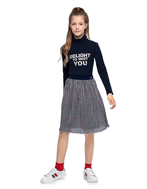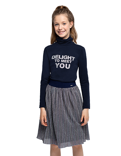 Комбинезон для девочки приталенного силуэта дополнен высоким воротником, стильным принтом в виде надписи на груди и вставками из контрастной ткани на плечах. Трикотажное полотно кулирная гладь гарантирует износостойкость и приятные тактильные ощущения.