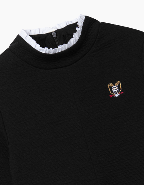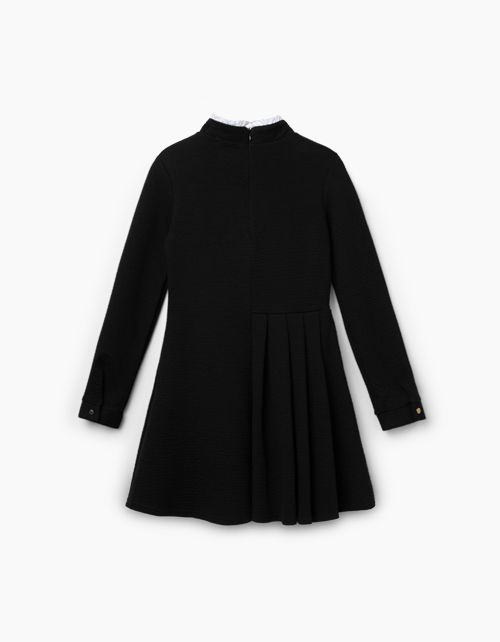 Черное платье А-силуэта с потайной молнией сзади и манжетами на кнопках. Выполнено из стойкого к сминанию трикотажа. Белая оборка на воротнике делает модель нарядной.