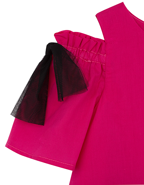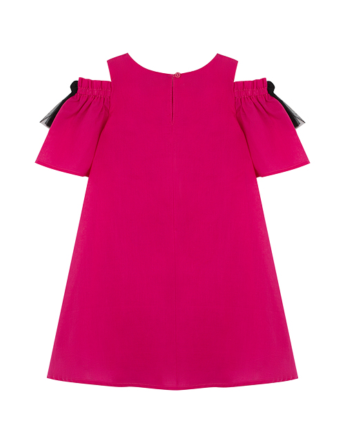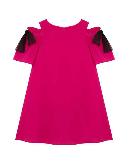 Нежное платье А-силуэта приведёт Вашу девочку в восторг! Актуальное цветовое решение, прекрасный "летящий" материал, стильный дизайн с авторскими яркими деталями - открытыми плечиками, милыми рюшами и бантиками - складываются в восхитительный образ