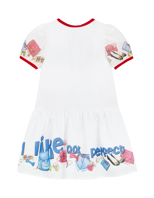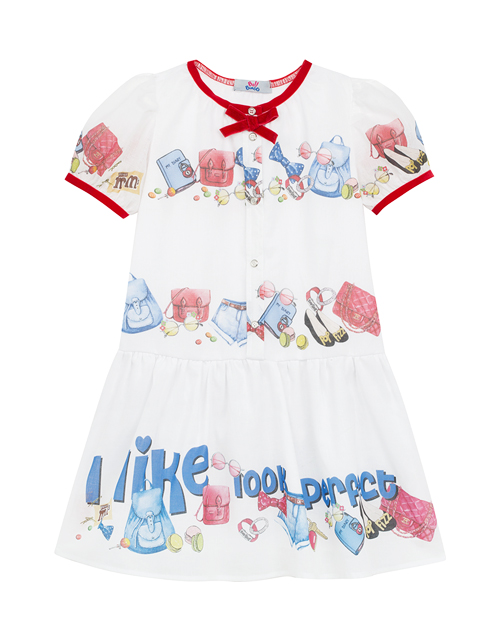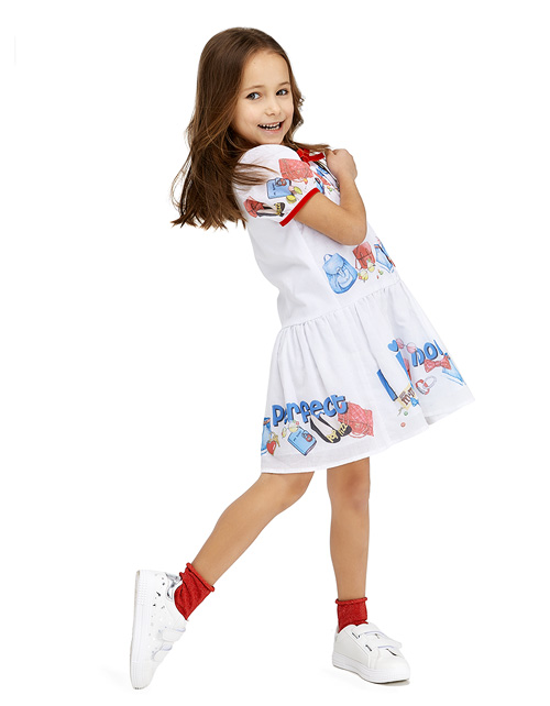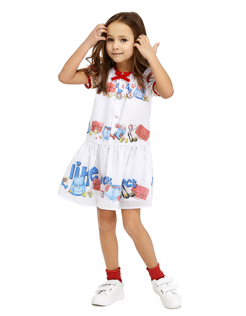 Милое платье понравится юной любительнице шопинга! Как классно смотрятся изображенные на модели разноцветные вещички, наполняя образ детской непосредственностью. Игривые милые рюши и отделка контрастной яркой лентой с бантиком усиливают это впечатление