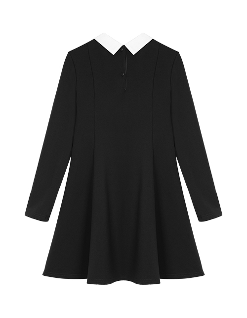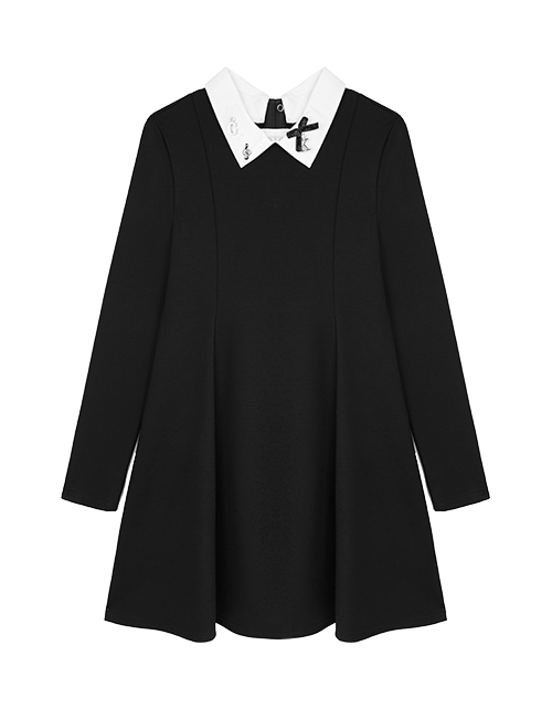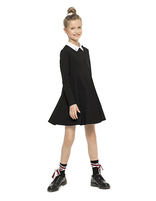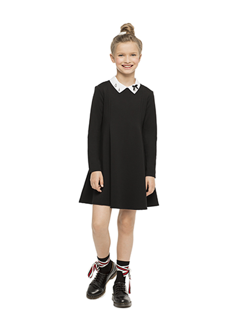 Изящное платье для девочки из джерси - синтез красоты и комфорта. Мягкий А-силуэт придаёт образу изящность, а белый отстегивающийся воротник с элегантным декором подвесками, делает платье превосходным повседневным вариантом.
