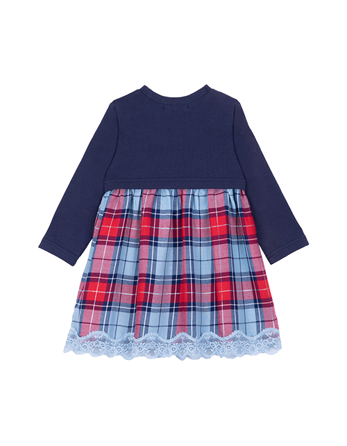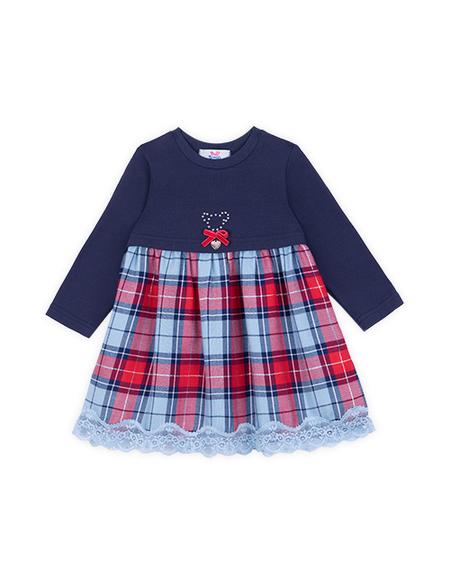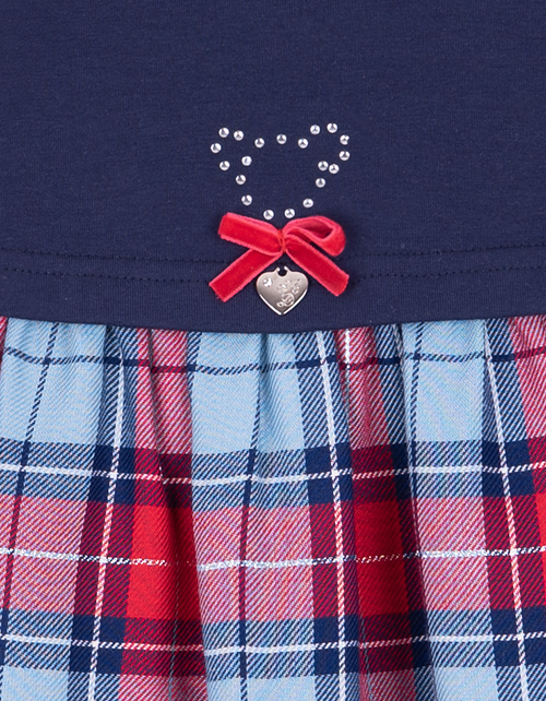 Платье для девочки свободного силуэта имеет отрезную талию и круглый вырез горловины. Изделие дополнено вышивкой стразами и юбкой в клетку с кружевом по низу подола. Верх платья выполнен из приятной к телу трикотажной ткани, юбка - из плательной.