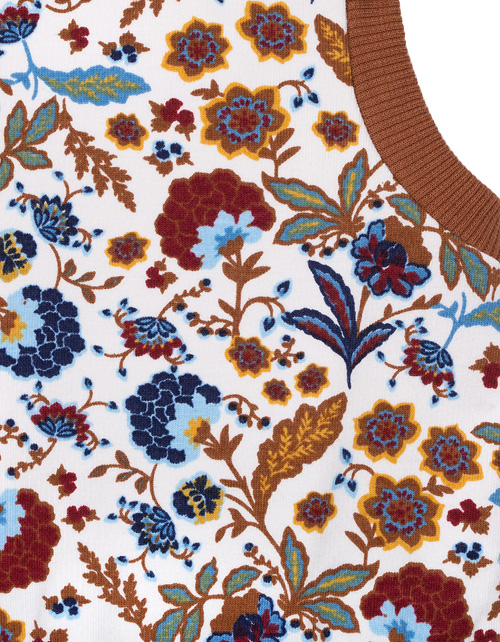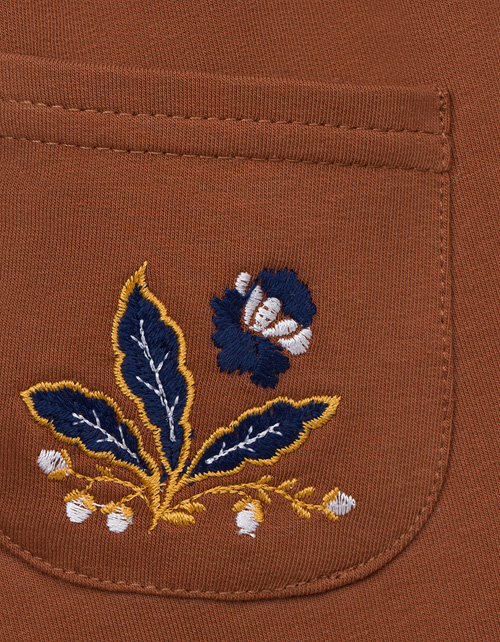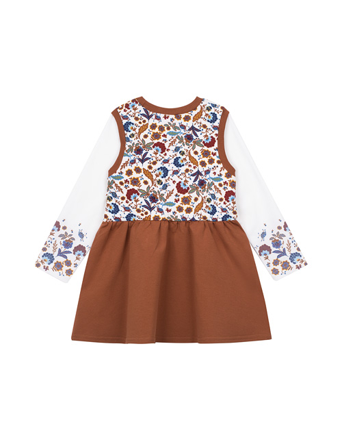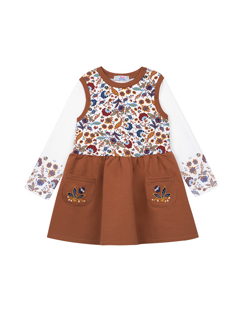 Платье для девочки имеет эффект многослойности за счет контрастного цвета рукавов и отделки горловины и проймы. Растительный принт есть на верхней части платья и рукавах, а два накладных кармана украшены вышивкой. Ткань футер мягкая и приятная на ощупь.
