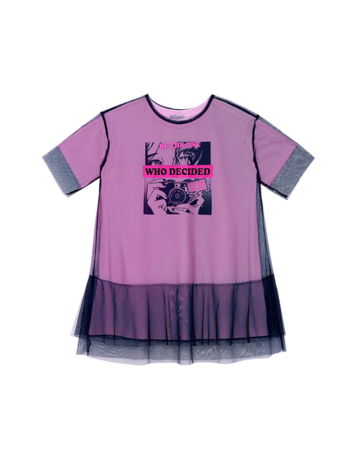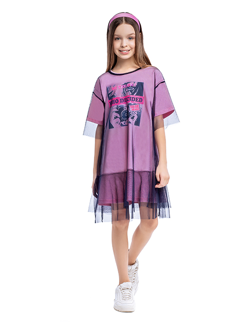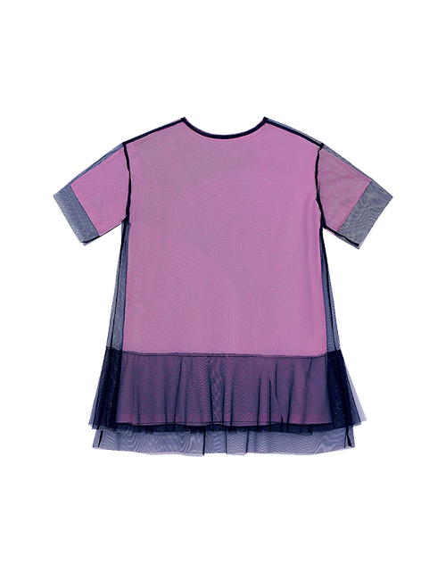 Темно-синее платье для девочки с круглым вырезом горловины и коротким рукавом. Отделка сетчатым полотном. Дизайнерское оформление в стилистике капсулы "Миллион лайков". Юбка с оборками.