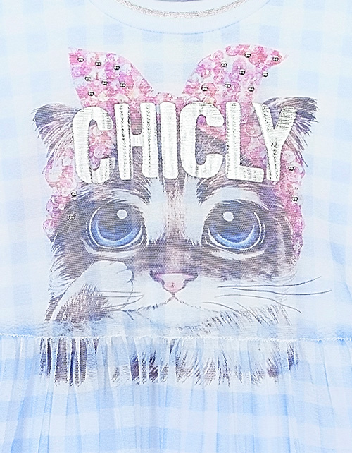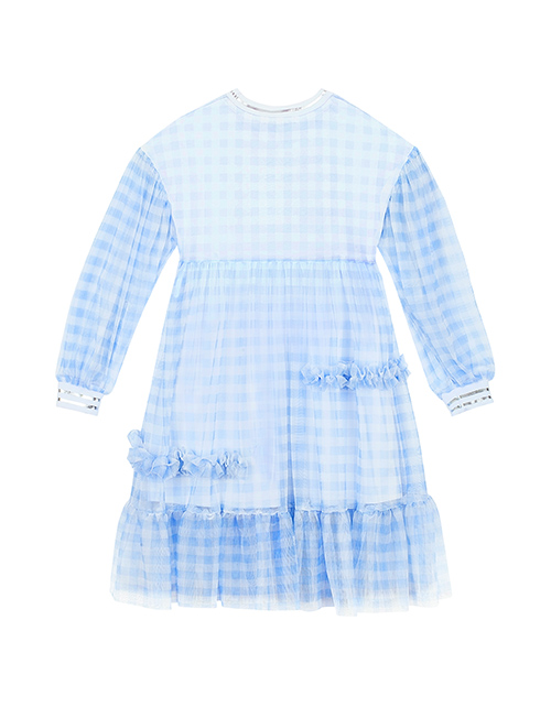 Клетчатое платье трапециевидного силуэта. Полупрозрачные объемные рукава и настрочные рюши. Трикотажная горловина и манжеты, декорированные печатью. Металлические стразы. Принты в стилистике капсулы "Event".