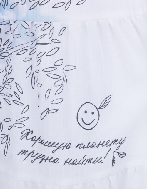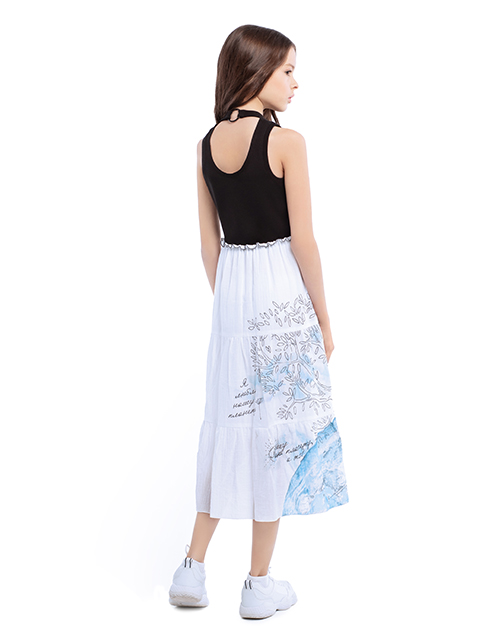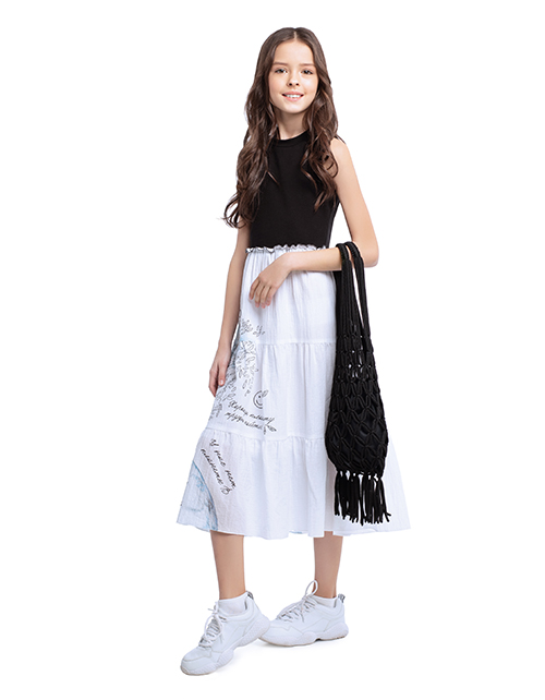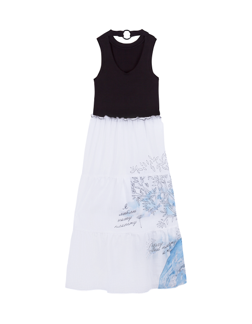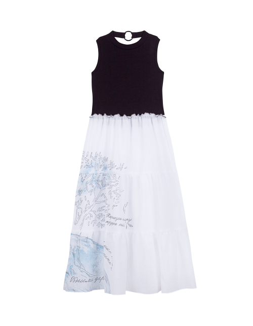 Нарядное длинное платье для девочки без рукавов из плательной ткани с отделкой из рибаны. Круглый вырез горловины и декоративная застежка на спинке. Юбка дополнена оборками и украшена нежным принтом.