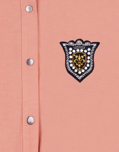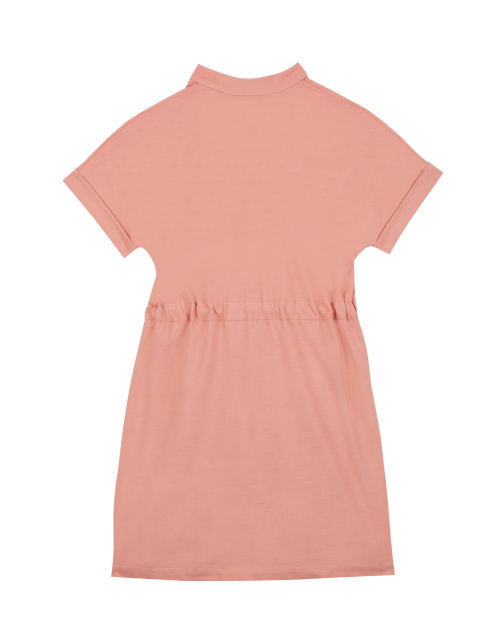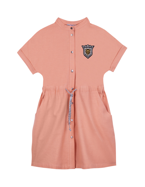 Платье для девочки цвета темный коралл. Застежка конструкции турникетная кнопка. Нашивка в стилистике капсулы "Армия стиля". Закрытый шнурок на поясе. Короткий рукав с подворотами.