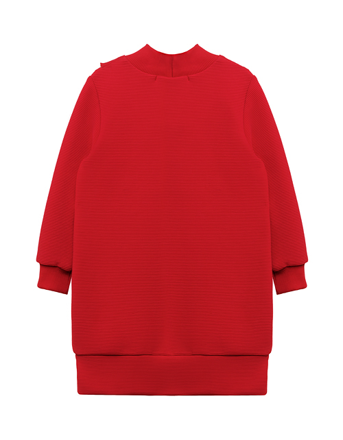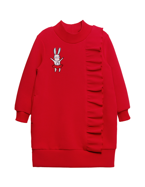 Платье из фактурного плотного материала создано, чтобы дарить радость. Для этой цели дизайнеры использовали модный элемент - воздушное украшение-волан, а также нашивку зайки. Высокое мягкое горлышко и потайные кармашки обеспечат комфорт.