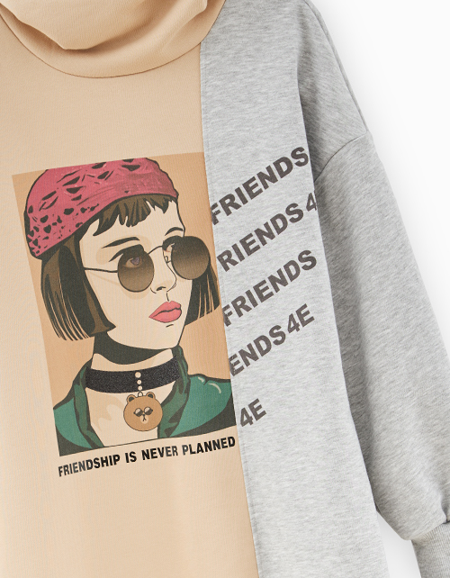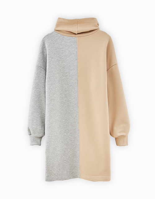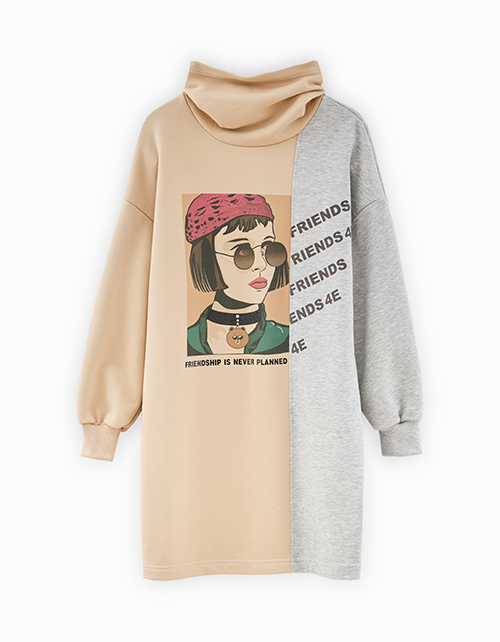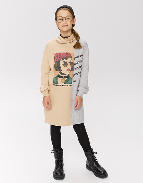Платье в стиле колор-блок. Комфортная модель прямого силуэта с воротником-трубой. Модель декорирована тематическим принтом.