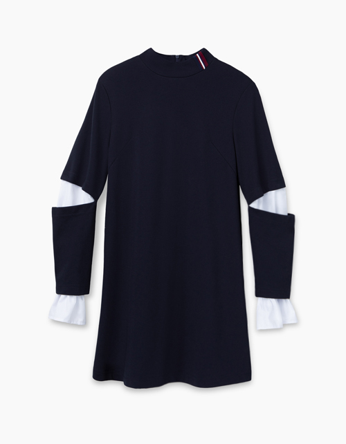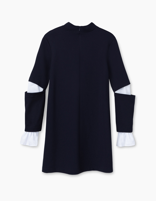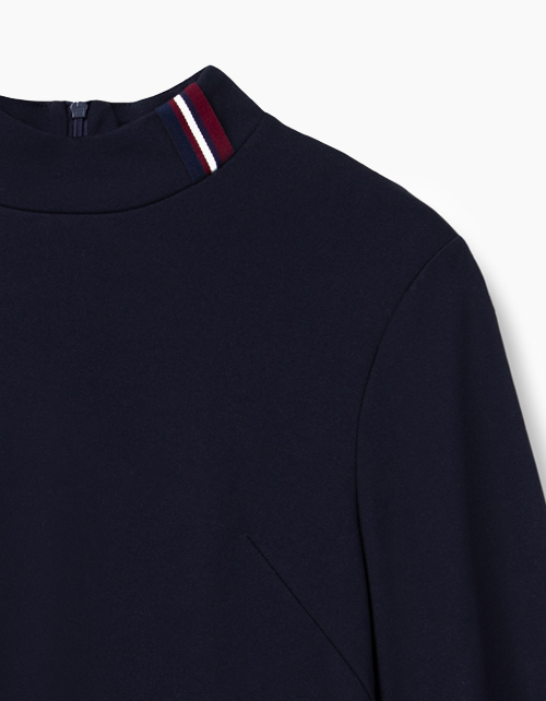 Школьное полуприлегающее платье, слегка расширенное. Воротник-стойка с трикотажной декоративной тесьмой. Застежка сзади на потайную молнию.