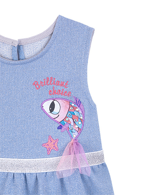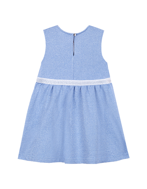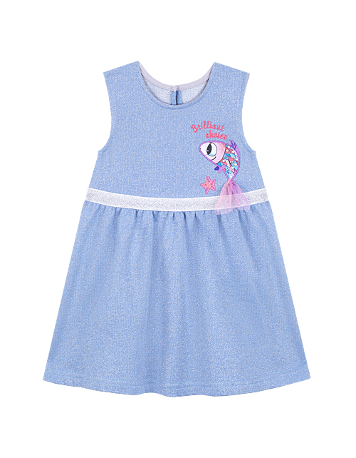 Голубое платье без рукавов для девочки. Полотно с включением мягкой люрексовой нити. Дизайнерское оформление в стилистике капсулы "Ариэлла". Стразы и функциональная застежка на пуговице. Декоративная белая полоска с блестками.