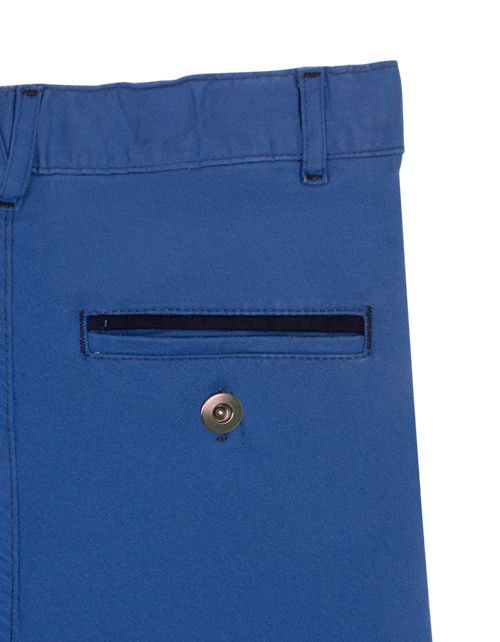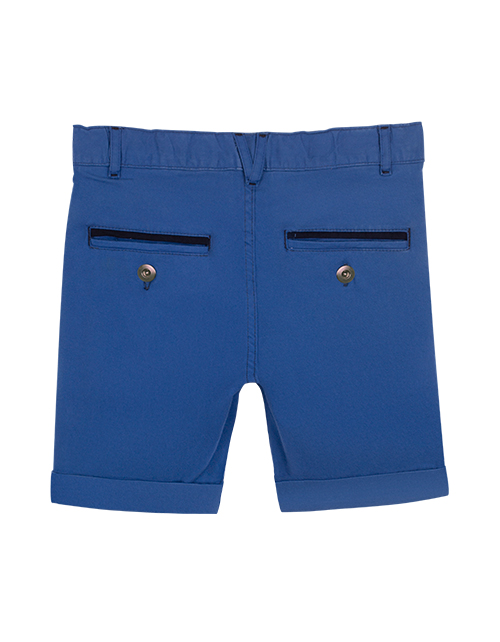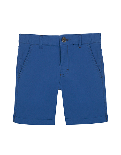 Синие шорты для мальчика. Передние и задние накладные карманы. Отвороты по низу изделия. Шлёвки по поясу.