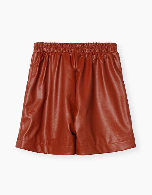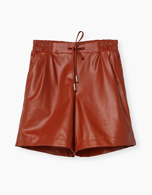 Стильные шорты из экокожи терракотового цвета. Свободного кроя, с завышенной линией талии и функциональными карманами-хулиганами. Хорошо сидят благодаря эластичному поясу, декорированному шнуром с золотыми наконечниками.