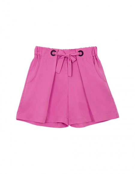 Свободные шорты на эластичном поясе, присборенные по линии талии, выполнены из светло-бирюзового лиоцелла. Обхват по поясу дополнительно регулируется шнуром. Удобные карманы по бокам делают модель практичной. Нашивка-сердечко украшает карман слева.