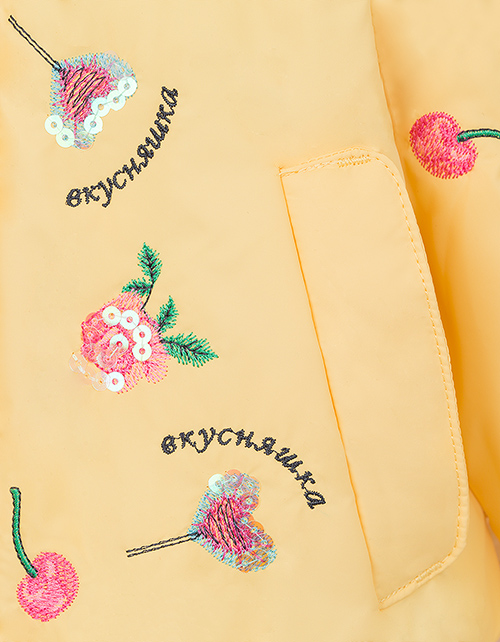 Милая курточка для самой очаровательной малышки! Привлекательная вышивка с любимыми "вкусняшками" подарит прекрасное настроение! Особую прелесть придаёт кокетливая рюша по низу изделия. Высокотехнологичная ткань обеспечит надежную защиту от холода и дождя