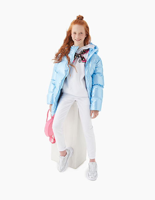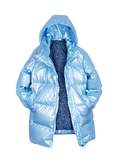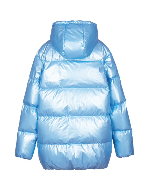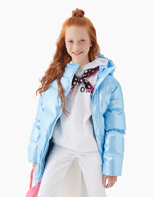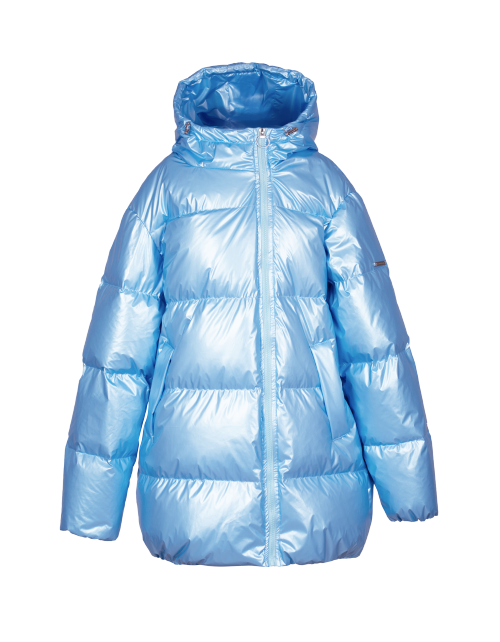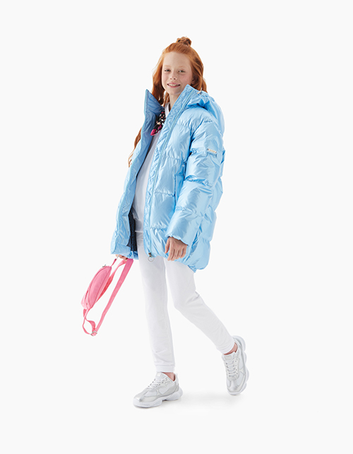 Куртка для девочки на пуху свободного силуэта дополнена капюшоном с высоким воротником, двумя карманами и косой застежкой молнией. Ткань плащевая дьюспо с жемчужным покрытием не пропускает влагу и ветер, гарантируя износостойкость изделия.