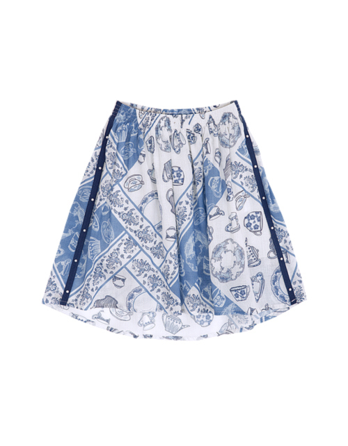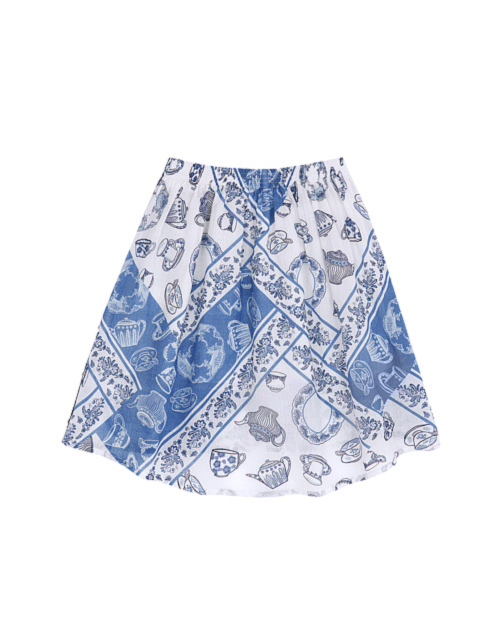 Набивная юбка для девочки. Трапециевидный силуэт с эластичной талией. Лампасы из киперной ленты и бусины "жемчуг. Оформление в стилистике капсулы "Чаепитие в саду.