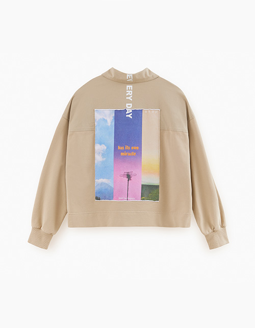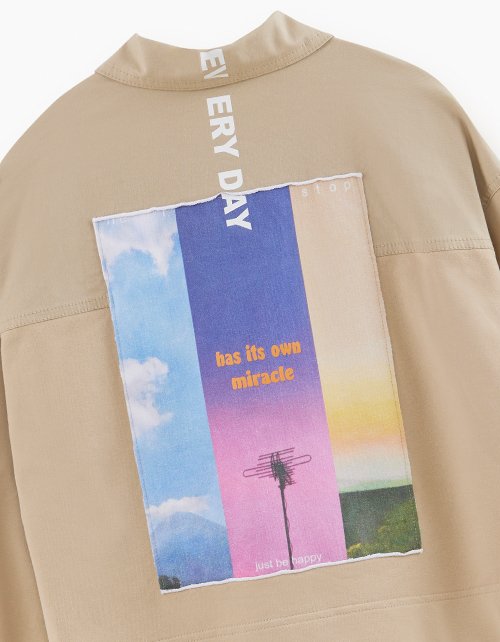 Бежевый жакет на кнопках для девочки. Укороченная модель, прямого расслабленного силуэта со спущенной линий плеча. Акцентный дизайн на спинке и накладные карманы. Хорошая альтернатива джинсовке