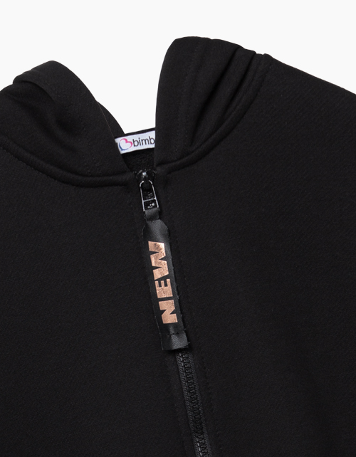 Толстовка с умеренно спущенным плечом. C капюшоном и карманами в перенесенных швах. Слайдер застежки и широкие лампасы - из экокожи. Декорирован надписью Never stop dreaming ("Никогда не переставай мечтать").