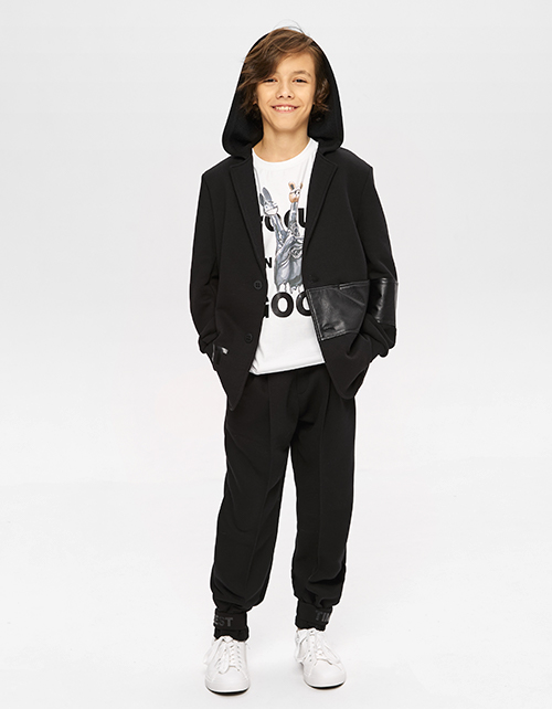 Стильный пиджак на мальчика. Модель с капюшоном и отделкой экокожей. Акцентные карманы.