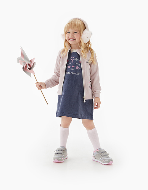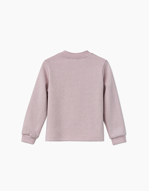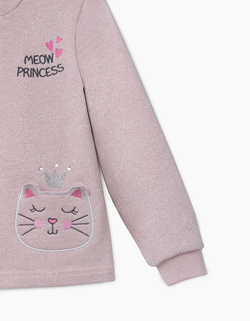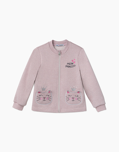 Меланжевый жакет для девочки с круглым вырезом горловины. Рукава из рибаны. Модель декорирована стразами, нашивкой и принтом в стилистике капсулы "Пушистые принцессы"