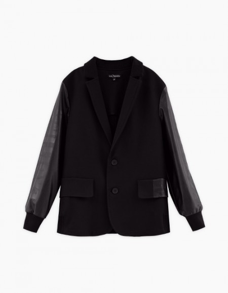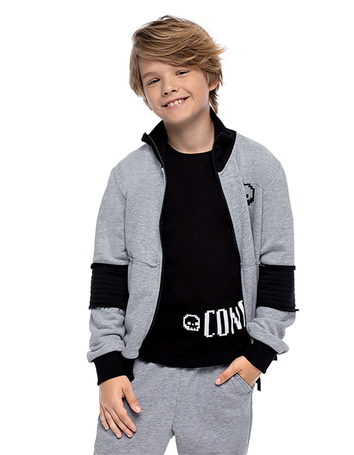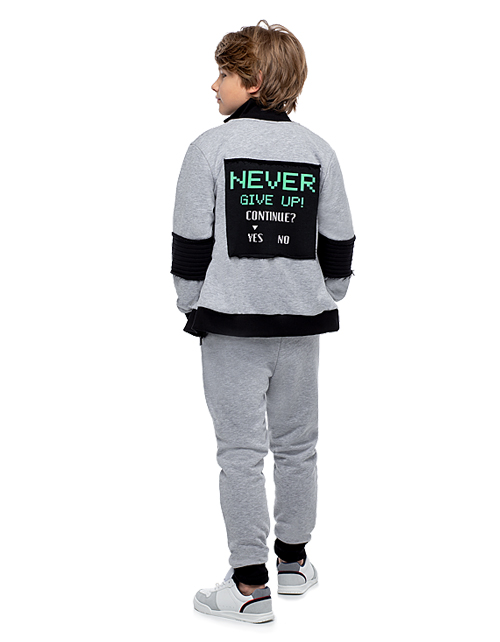 Жакет для мальчика в спортивном стиле имеет высокий воротник, застежку молнию и манжеты на рукавах. Изделие дополнено стильным принтом с надписью и декоративной строчкой. Трикотажная ткань футер гарантирует износостойкость и приятные тактильные ощущения.