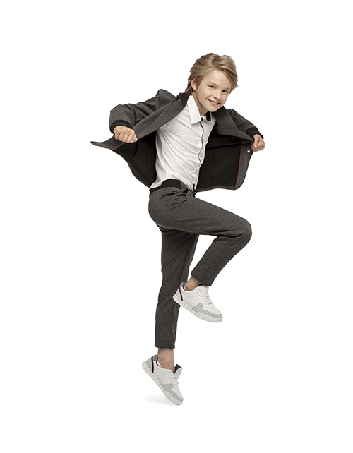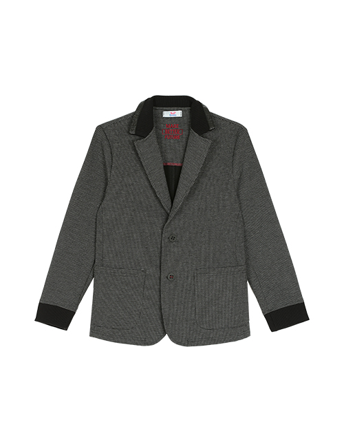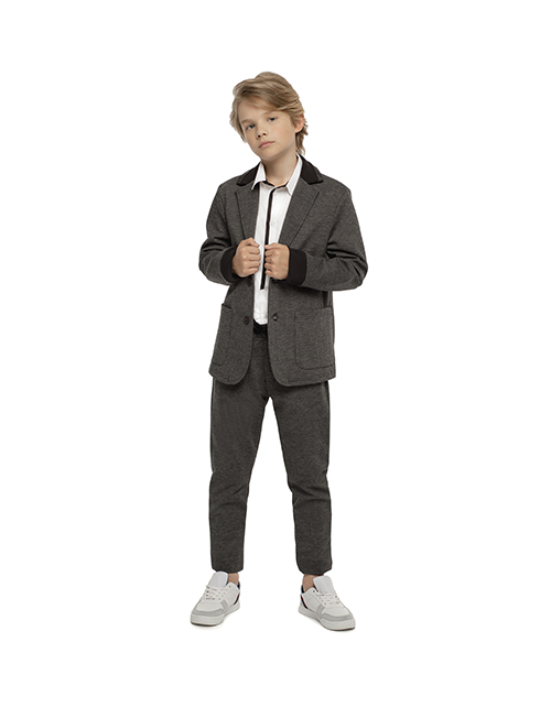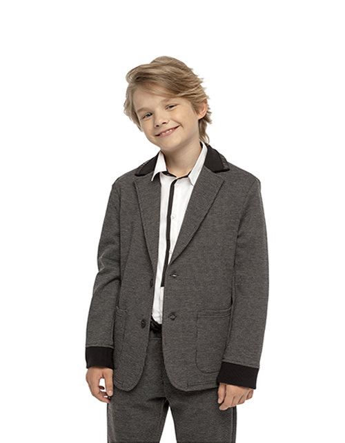 Пиджак для мальчика из комфортного трикотажа позволит подчеркнуть собственную индивидуальность, не нарушая школьных правил! Сочетание узора "пье-де-пуль", рельефного полотна оттоман и эксклюзивного декора делают жакет ярким элементом модного образа.