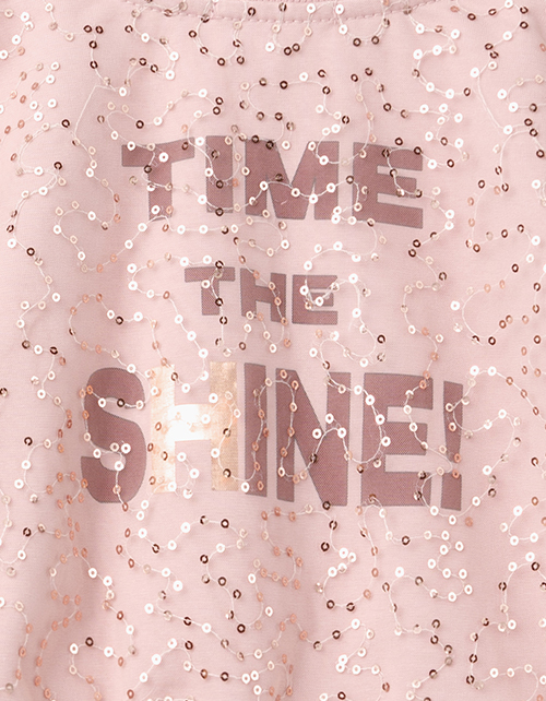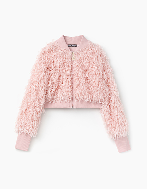 Укороченный нарядный жакет для девочки-подростка. Застегивается на молнию. Выполнен из розового футера, покрытого сетчатым полотном с пайетками, и ультрамодной ткани в виде перьев. Манжеты, воротник и низ - из рибаны