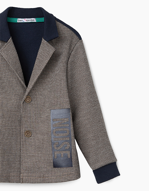 Жакет свободного прямого силуэта из трикотажного полотна и футера, с манжетами из рибаны. Застежка на кнопки. Декорирован вышивкой на рукавах, принтом NOISE ("ШУМ") спереди и контрастной киперной тесьмой по воротнику